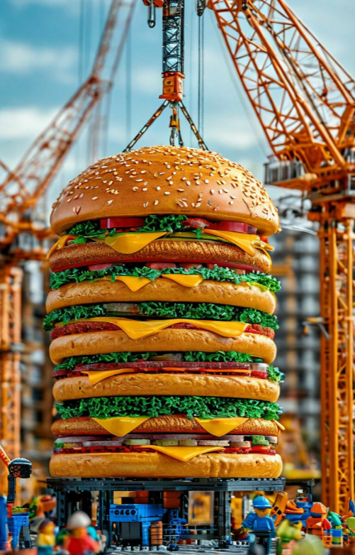 В мире, где архитектурные амбиции давно перешли границы разумного, развернулся грандиозный проект: возведение гигантского, многоэтажного гамбургера. Не просто гамбургера – монументального сооружения, что возвышалось над городом, словно фантастическое видение, пришедшее из снов гурмана. Макросъемка приближенной камеры раскрывала этот замысловатый мир с пугающей детализацией. Каждый ингредиент, каждая булочка, каждый кусочек салата был увеличен до размеров дома, создавая сюрреалистичную картину. Проекции накладывались друг на друга, создавая эффект мультипликативного наложения, где реальность переплеталась с фантазией. Объем, глубина резкости и контраст работали в унисон, затягивая зрителя в кадр, словно в воронку, из которой нет выхода. Башенные краны, словно гигантские насекомые, снували вокруг строящегося чуда, неся на своих стропах гигантские котлеты из мраморной говядины, размером с грузовой автомобиль. Строители, в своих маленьких касках, казались муравьями, возводящими свой исполи