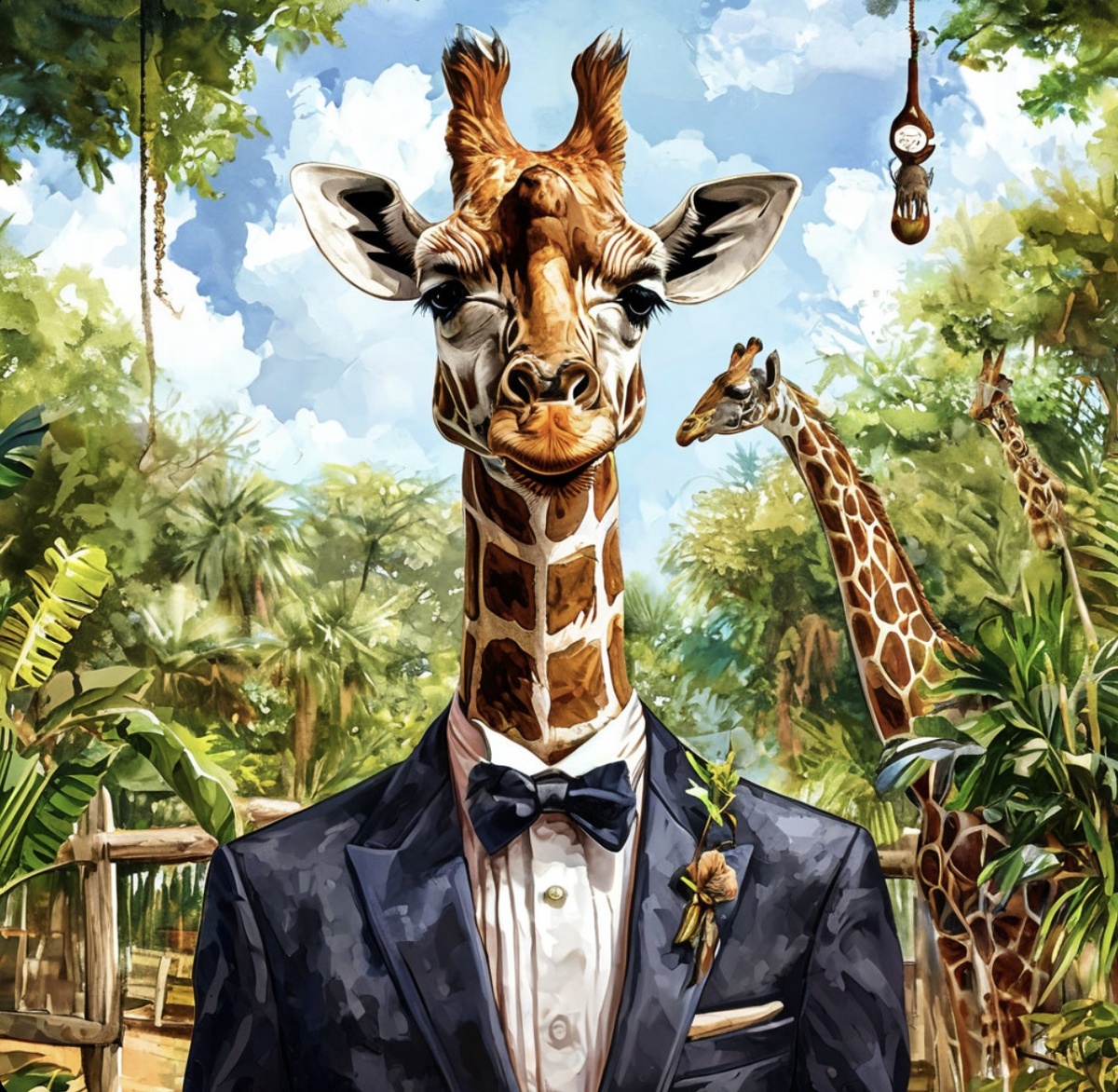 В солнечный день в зоопарке города Мечтаний произошло необычайное событие. Жираф по имени Лилу, известный своей элегантностью и утонченным вкусом, решил надеть смокинг. Это был не простой смокинг, а настоящее произведение искусства, сшитое специально для его длинной шеи и стройного тела. Когда Лилу вышел на прогулку в своем новом наряде, все посетители зоопарка замерли от удивления. Дети показывали на него пальцами и восторженно кричали: «Смотрите, жираф в костюме!». Взрослые не могли поверить своим глазам и протирали очки, думая, что им показалось. Даже другие животные в зоопарке были поражены видом Лилу. Обезьяны перестали качаться на ветках, львы прекратили свой величественный рык, а пингвины выстроились в ряд, словно почетный караул. Среди посетителей зоопарка была маленькая девочка по имени Марина. Она была известна своей любовью к животным и необычным историям. Увидев Лилу в смокинге, Марина не могла сдержать восторга. Она подбежала к вольеру жирафа и начала с ним разговаривать.