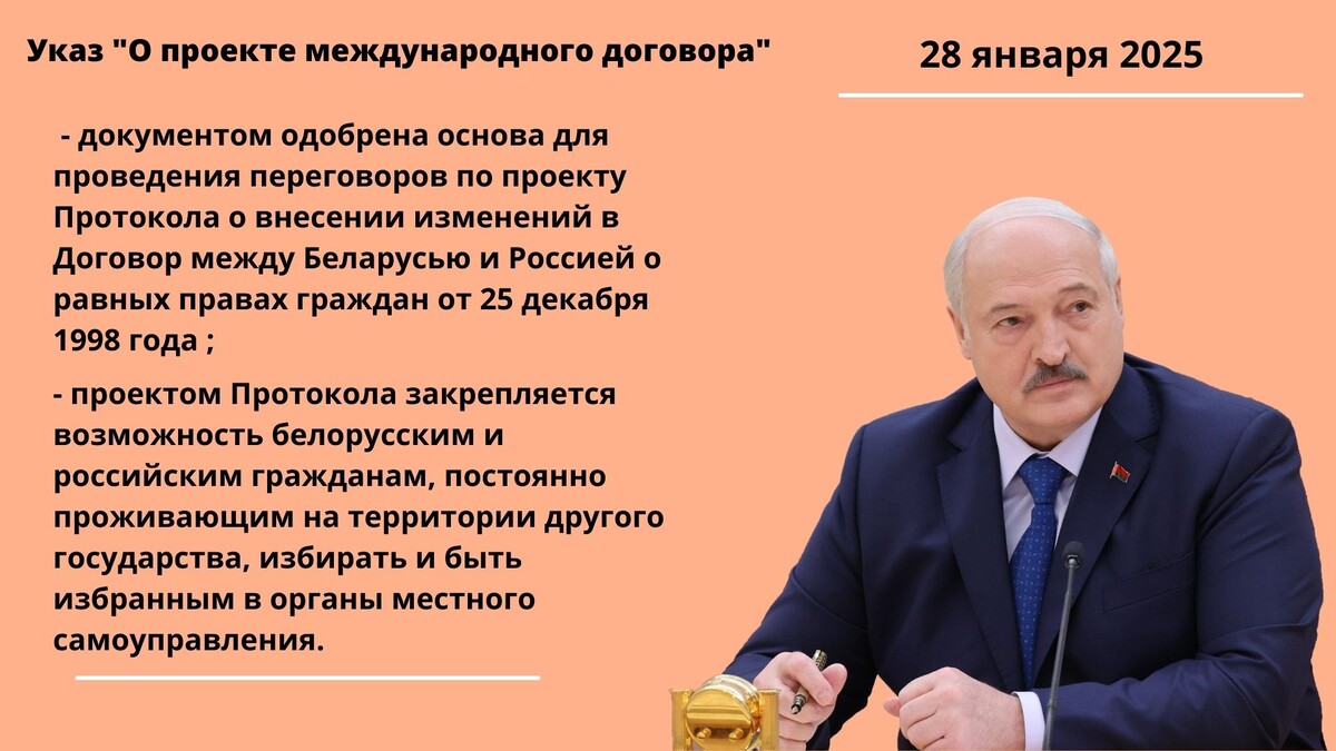 Проектом Протокола закрепляется возможность на обоюдной основе белорусским и российским гражданам, постоянно проживающим на территории другого государства, участвовать в местных выборах - избирать и быть избранным в органы местного самоуправления. Провести переговоры и подписать данный Протокол Президент поручил МИДу. Подписывайтесь –@prezident_lucashenko_reshaet
