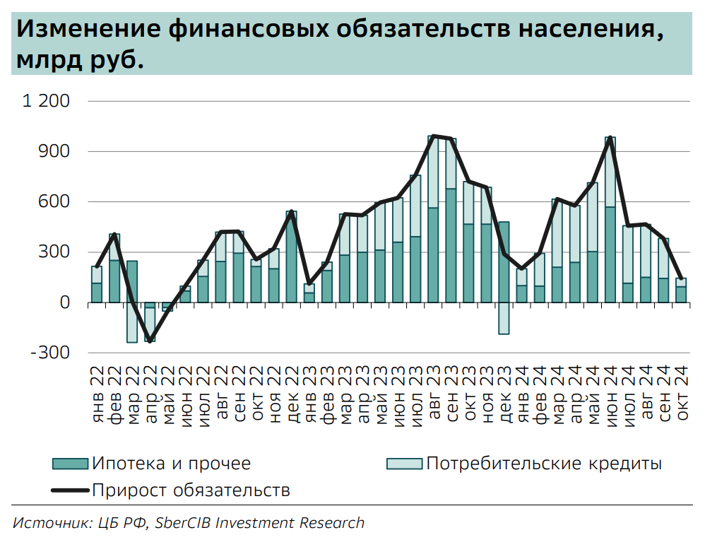 В своих постах я пишу о том, что на фоне повышения ключевой ставки кредитование замедляется. И если с июля это замедление прослеживалось только в потребительском кредитовании, то в последнее время и в корпоративном сегменте. Замедление кредитования очень важный фактор в борьбе с инфляцией. Особенно в текущей ситуации, когда инфляция растет из-за дисбаланса между спросом и предложением в экономике (предложение просто не успевает расти за спросом). Повышая ключевую ставку, ЦБ снижает спрос в экономике, делая кредиты менее недоступными. В этом посте я предлагаю наглядно посмотреть, насколько сильно сокращается кредитование населения. На графике «Изменение финансовых обязательств населения, млрд руб.» мы видим общую динамику кредитования населения. Каждый столбец показывает на сколько выросли обязательства населения за месяц. Мы видим, как эти столбы начали снижаться с июля, после отмены льготной ипотеки, а в октябре они достигли минимальных объемов. Если быть точным, то обязательства насе
