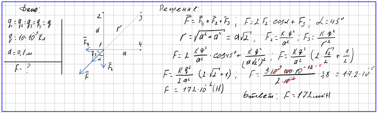 Задача №9. Четыре одинаковых точечных заряда по 10нКл каждый расположены в вершинах квадрата со стороной 10см. Найти силу, действующую со стороны трех зарядов на четвёртый. Для подробного изучения решения задачи посмотрите видео: