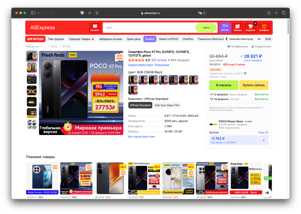 Официальные ценники в М.Видео и ДНС пока неизвестны, но я думаю, очень маловероятно увидеть что-то ниже 40 тысяч за базу. Так что смело могу рекомендовать покупку на AliExpress. POCO всегда глобалки, так что риск не угадать с версией минимален. Еще и доставка с Али у меня заняла всего 12 дней.