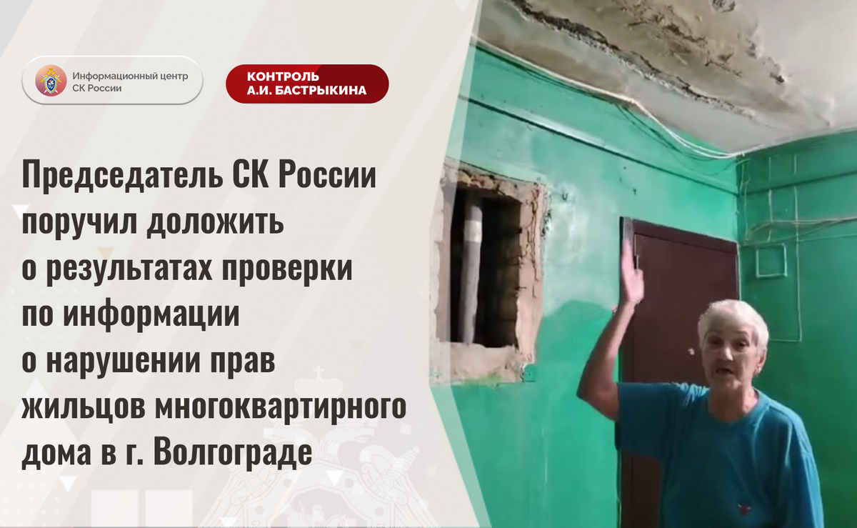 Председатель СК России поручил доложить о результатах проверки по информации о нарушении прав жильцов многоквартирного дома в г. Волгограде В сети Интернет размещено видеообращение пенсионерки из города Волгограда о ненадлежащем содержании многоквартирного дома по улице Германа Титова. Длительное время целостность кровли здания, 1988 года постройки, нарушена, из-за чего жилые помещения и места общего пользования систематически затапливаются. В результате в квартирах образовались сырость и плесень, потолочные перекрытия разрушаются. Многочисленные обращения граждан в уполномоченные органы результатов не принесли. В СУ СК России по Волгоградской области по данному факту организована процессуальная проверка. Председатель Следственного комитета Российской Федерации Александр Иванович Бастрыкин поручил руководителю СУ СК России по Волгоградской области Василию Ивановичу Семенову доложить о промежуточных результатах процессуальной проверки и принятом по итогам решении. Исполнение поручения,