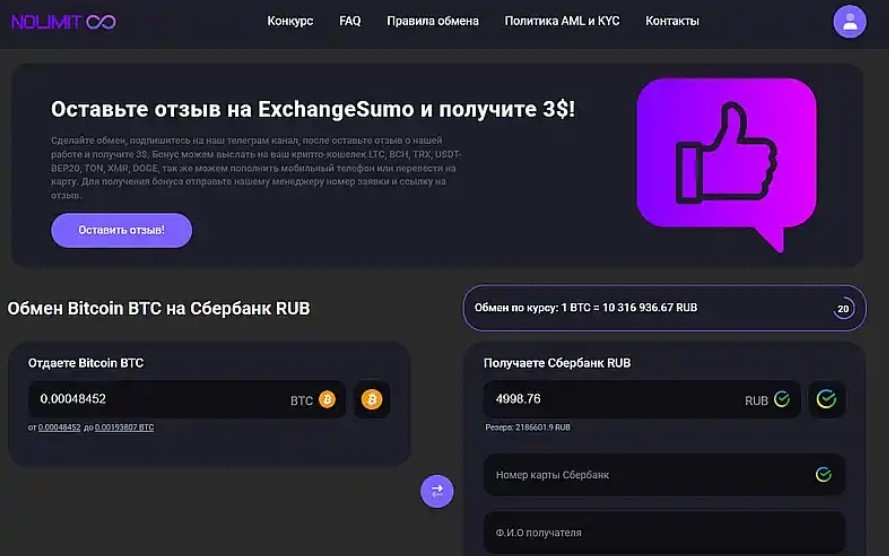 Nolimit.cc — сервис для быстрого обмена криптовалют на рубли с минимальным временем обработки заявок (5–15 минут). Платформа ориентирована на удобство, безопасность и прозрачность. Преимущества сервиса Как работает обмен? Комиссии Бонусы и реферальная программа Отзывы и жалобы