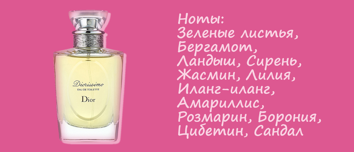 Великий Кристиан Диор так любил Диориссимо, что нарек его ароматным выражением своей души. Чем же, если не ландышами, может пахнуть душа истинного француза? Жители Франции придают этому цветку особое значение. По легенде, в шестом веке на французской земле жил отважный рыцарь, Святой Леонард. Устав от сражений, он добился от короля освобождения от службы и поселился в укромной лесной лачуге. В том лесу обитал страшный дракон, выжигавший все вокруг. Долгие годы святой сражался с ним и, наконец, поверг. Из земли, где пролилась кровь дракона, выросли ядовитые колючки. Кровь Леонарда превратилась в нежные белые ландыши. Создал Diorissimo парфюмер Эдмон Рудницка. Это самый натуральный ландышевый парфюм, который только можно найти. Также композиция изобилует сочной зеленой листвой и пыльцой сирени. А смягчает Диориссимо белоцветочная связка из чубушника и лилии. Вечная классика.