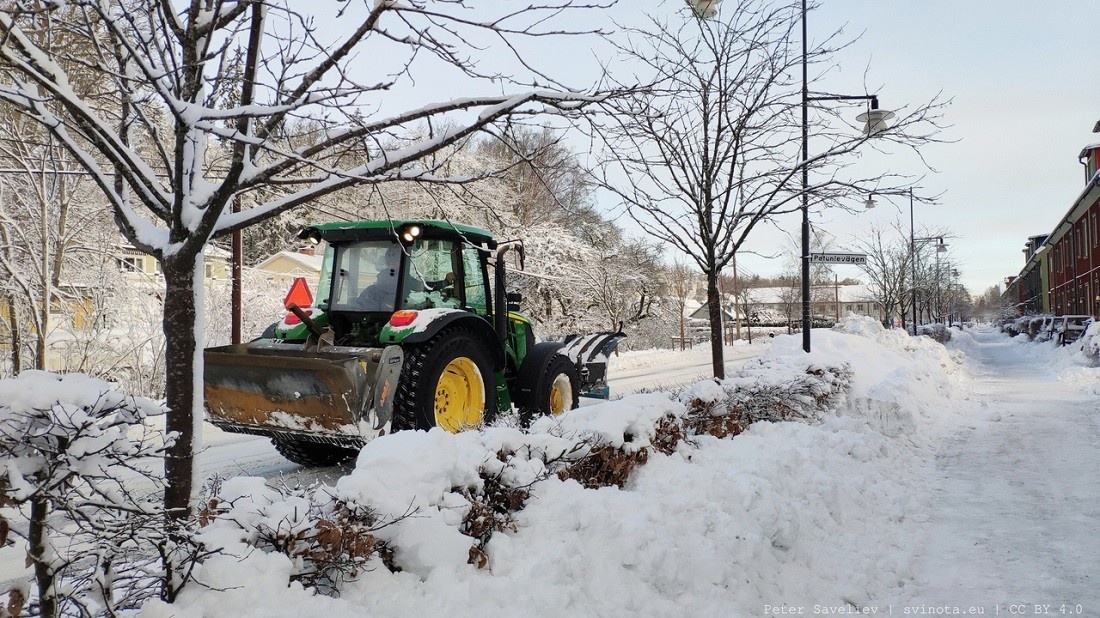 Главное условие — это возможность мобилизации. Не могу сказать «всегда и везде», но в нашей деревне уборка снега с автомобильных дорог очень часто проходит чуть ли не в режиме реального времени — с учётом интенсивности осадков и плотности трафика. В центре Стокгольма, конечно, всё иначе, местами там с уборкой снега сильно хуже, но на то он и центр.