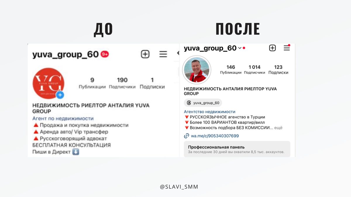 Привет! Меня зовут Влада Ердикова, я маркетолог и стратег в соцсетях, а так же я основатель SMM агентства SLAVI. Основным видом нашей деятельности является привлечение клиентов в бизнес с помощью социальных сетей. Мы системно продвигаем проекты, внедряем новые инструменты и технологии, в том числе чат-боты и нейросети. Особенность этого кейса в том, что после проведенной нами работы над аккаунтом, клиент практически не тратит времени и сил на ведение соцсетей, получая клиентов, готовых к покупке. Клиент: Новое агентство недвижимости в Турции, ориентированное на русскоязычную аудиторию Период работы: с 15.02.2023- по настоящее время Цель: Увеличение числа клиентов, повышение узнаваемости бренда, полное делегирование ведения соцсетей На первоначальном этапе мы провели анализ целевой аудитории, анализ конкурентов и разработали стратегию продвижения,а так же составили подробный контент-план по сторис и рилс. Результат после первого месяца работы: Новая аудитория приходит с рилс и тарг
