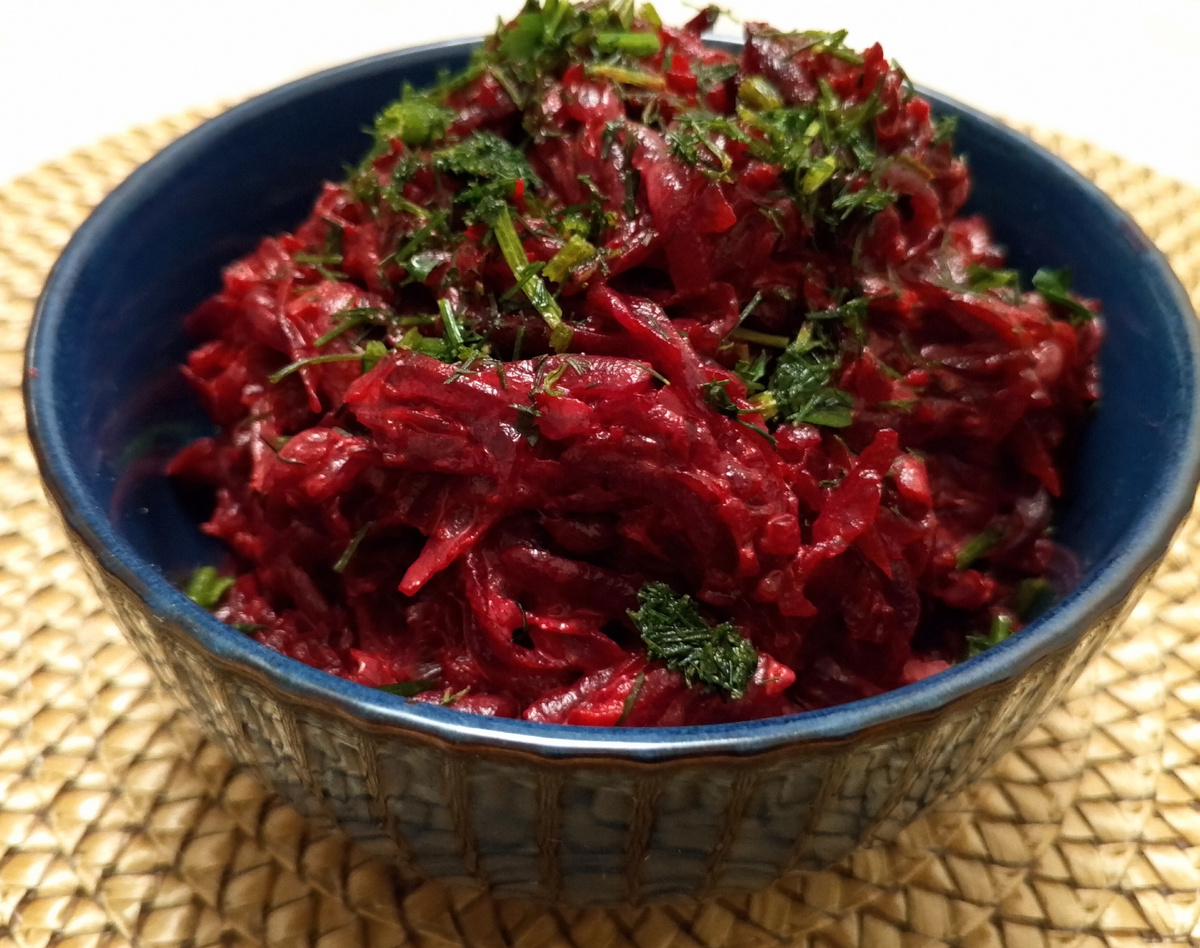 Салат из варёной свёклы с чесноком и майонезом.