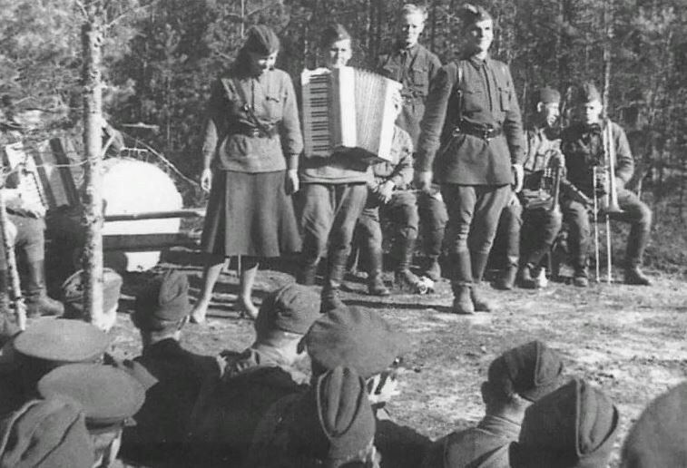 В частях Красной армии действовало более 4 тысяч театрально-концертных и цирковых бригад и 25 фронтовых театров. В их составе были как молодые артисты, так и те, кто уже был знаменит и любим зрителями по всей стране: Галина Уланова, Ольга Лепешинская, Владимир Зельдин, Клавдия Шульженко, Аркадий Райкин, Валентина Серова, Лидия Русланова, Нина Сазонова и многие другие.