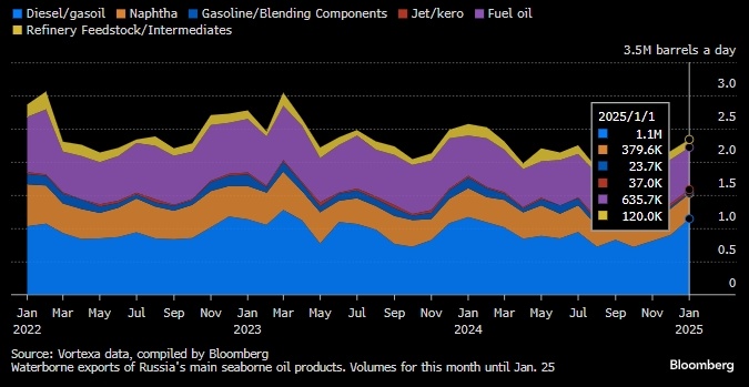 Поставки дизеля/газойля выросли на 27% м/м до самого высокого уровня за год. Российский экспорт нефтепродуктов, похоже, достигнет 11-месячного максимума, демонстрируя раннюю устойчивость к ужесточению санкций США и атакам украинских беспилотников на нефтеперерабатывающие заводы страны. Согласно данным аналитической компании Vortexa, собранным агентством Bloomberg, объемы добычи за первые 25 дней января составили около 2,3 млн баррелей в день. Если этот показатель сохранится, это будет самый высокий месячный объем с февраля. Резкий рост поставок дизельного топлива компенсировал сокращение поставок других продуктов, включая нафту и мазут, на долю которых приходится примерно половина экспорта нефтепродуктов из России. Морские поставки нефти из России дают трейдерам возможность оценить уровень добычи, а также признаки воздействия последних санкций США на энергетический сектор. Поставки сырой нефти пока также остаются на прежнем уровне, свидетельствуют данные отслеживания судов, собранные а