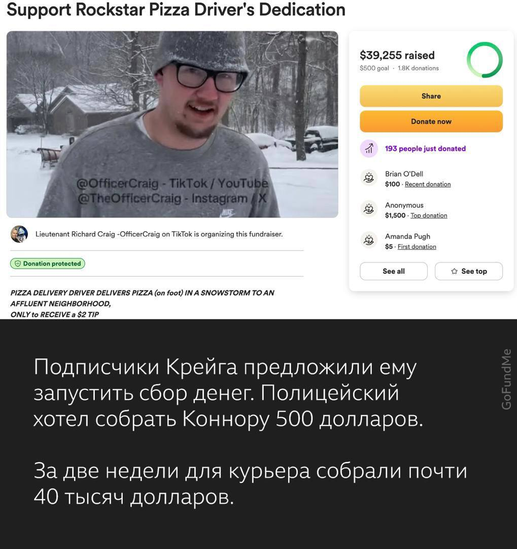 Итак, к истории США. Во время снежного шторма в Индиане курьер отвозил пиццу, шел пешком около километра по заметенной трассе, чтобы доставить заказ и попал на видео полицейского-тиктокера. Парню-курьеру 20 лет, он копит на обучение и содержит свою бабушку. Подписчиков полицейского тронула ответственность парня и они пожертвовали ему почти 40 тысяч долларов — курьер планирует купить машину, отложить на колледж и пожертвовать на благотворительность. Такая добрая история. Собственно, что-то подобное можно повторить и у нас. Возможно, размеры сборов будут и поменьше, но кто же против?! Чтобы это повторить нужно просто в соцсетях запустить и завирусить какое-то хорошее дело. Не факт, что получится с первого раза, но получится точно. Люди такое любят! Вообще же, как мы видим, хорошие дела и самоотдачу в работе всегда Мир вознаграждает. Всем по разному. Всем в разное время, но это работает. Иногда можно не ждать вот таких 40 тысяч, а просто делать и подарок будет получен в том или ином виде