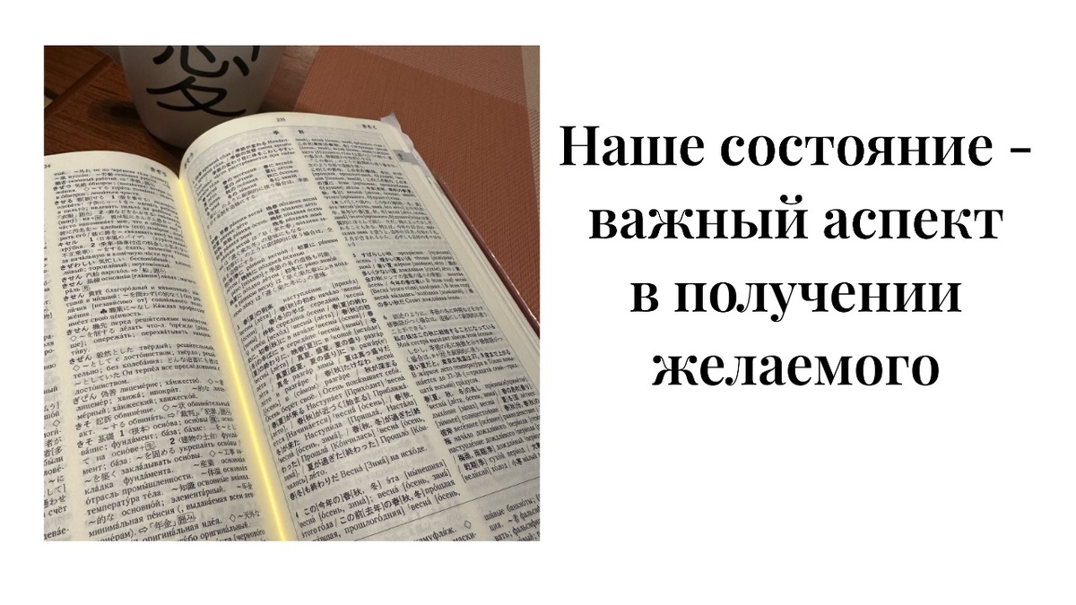 На тренингах Технологии ESSE мы работаем с нашим состоянием. По сути - это такие мы и такое ощущение себя (излучающееся изнутри), в котором нам устойчиво, уверено, вне каких-либо колебаний и сомнений. Ведь в жизни может происходить многое, наше состояние очень может меняться и колебаться, но при этом мы можем сохранять и ощущать что-то устойчивое внутри нас, на что мы можем всегда опереться. Исследуя тему желаний, получения и неполучения желаемого, я обратила внимание, что, действительно, очень важно состояние, из которого я что-то хочу. Приведу пример из своей жизни. Когда я переехала в Санкт-Петербург, я работала в одной фирме переводчиком. Параллельно училась в Японском центре. У меня был хороший разговорный язык и я с удовольствием осваивала японскую письменность. В офисе мне дали пользоваться японским словарем издательства «Кэнкюся». Он был просто бомбический! Я восхищалась тем, как он составлен! По нему можно столько нового узнать, через него любовь к японскому языку просы