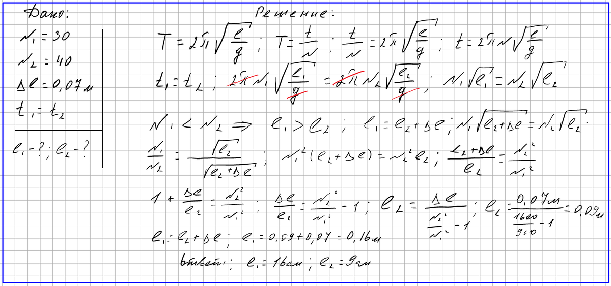 Математический маятник. Задача №1. Два математических маятника за одно и то же время совершают первый N1 = 30, а второй N2 = 40 колебаний. Какова длина каждого из них, если разность их длин Δl = 7 см Для подробного изучения решения задачи посмотрите видео: