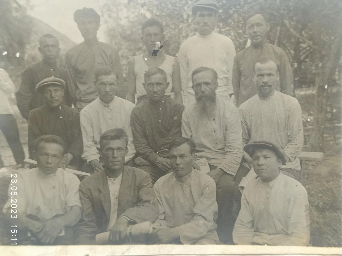 В дебрях интернета наткнулся на очень любопытную пожелтевшую фотографию с далеких 30х годов прошлого века. Эту фотографию выложил житель соседней деревни Торхлово Герольд Лаврентьев. Казалось бы, нет никаких шансов найти на этом фото знакомого человека… ведь прошло уже почти 100 лет Я попробовал улучшить качество снимка через редактор, получилось чуть лучше: Гадать, кто же эти люди, не пришлось. Раньше народ были мудрее и записывал на обратной стороне фотографии всех, кто запечатлен на этом кадре. От времени запись сильно выцвела, но Герольд восстановил большую часть информации. Вот что получилось: 1 ряд слева направо: 1.Дмитриев Михаил секретарь Ойкасинского сельсовета