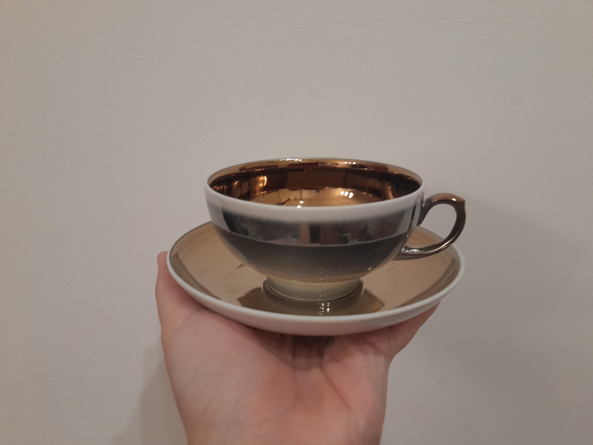 Ох, друзья, надеюсь, вы меня вчера не потеряли. Я немножко сломалась. Я обычно стараюсь ежедневно выпускать статью, но вчера была не в состоянии. Сейчас уже чувствую себя лучше, могу рассказать про две последние покупки. Два сервиза (неполных) уже у нас, их и покажу, а ещё два едут к нам, их покажу, когда приедут. Начну с довольно необычного. Шесть чайных пар, сахарница и молочник. На чашках и блюдцах клеймо Дулево. Так чашка выглядит изнутри. А так - снаружи. Как по мне, очень необычно. Причём создаётся впечатление, что чайная пара больше, чем в действительности. В действительности же размеры стандартные, 14 см в диаметре блюдце, 250 мл объем чашки. А вот с сахарницей и кофейником/чайником непонятно. Клеймо не отчётливое. На сахарнице - аналогично. Вот клеймо. При том, что на чашках - обычный сокол. Сервизы такие больше не нашла, видимо, редкость. За весь отдали 500 рублей. Ну и второй сервиз - "Барбарис", ДФЗ (Вербилки). Неполный. За сахарницу, чайник (со сколами), 3 чайных па