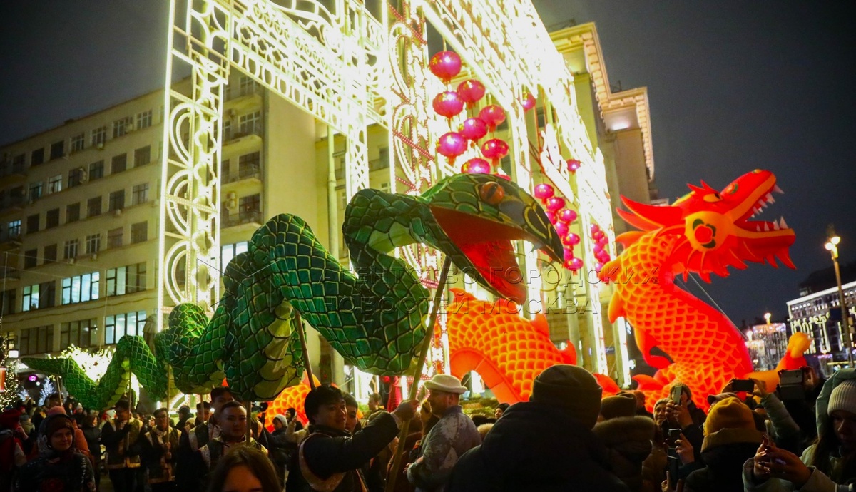 Привет, друзья! Уже все встретили Восточный Новый год. Но забывать такую яркую красоту пока не хочется. Особенно глядя на заунывный непроходящий дождь за окном. Январский дождь — понятие новое. А я предлагаю пару-тройку интересностей, замеченных мною в эти дни, по поводу современной встречи зимнего праздника. На этом красивом фото — на улице лихо танцуют вместе Дракон и Змея. Но это не Китай, а Россия. Это Москва! Да, мы бы очень удивились этой картинке ещё совсем недавно. А вот теперь, уже второй год подряд, Москва публично отмечает праздник Восточного Нового года. И, как видим, желающих принять участие в таком ярком шоу в городе немало. Жители нашей столицы с удовольствием прогуливаются по ярмаркам, устроенным по этому случаю. Постепенно москвичи привыкают к китайским праздничным мелодиям, знакомятся с традициями встречи Нового года, интересуются восточными сувенирами. На фото видно, что на транспарантах написано — С китайским новым годом! Странно🙄. Ведь Восточный Новый год по-друг