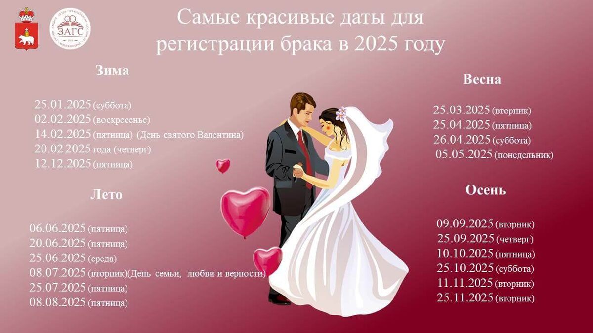 В ЗАГСе Пермского края назвали самые красивые даты для свадьбы в 2025 году