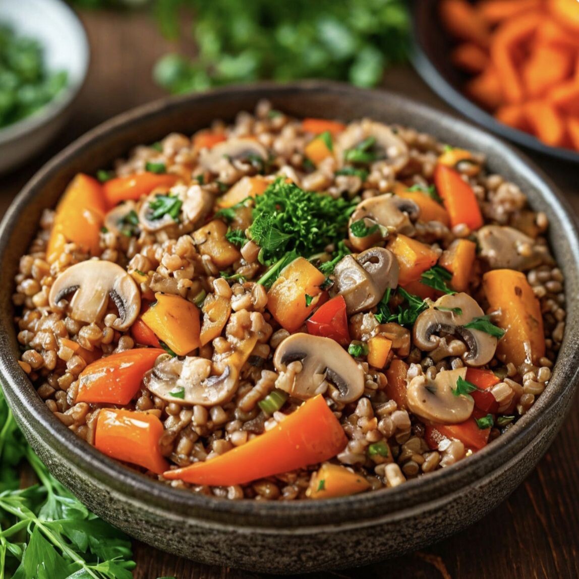 Ингредиенты (на 2 порции): Приготовление: КБЖУ (на порцию): Почему это полезно: Гречка — отличный источник медленных углеводов и железа, а овощи и грибы добавляют клетчатку и витамины. Блюдо легко приготовить и оно идеально подходит для правильного питания.