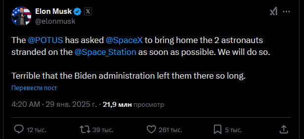 "Президент (@POTUS) попросил @SpaceX как можно скорее вернуть двух астронавтов, застрявших на @SpaceStation. Мы это сделаем. Ужасно, что администрация Байдена оставила их там так надолго." - заявил Маск во вторник вечером в X.