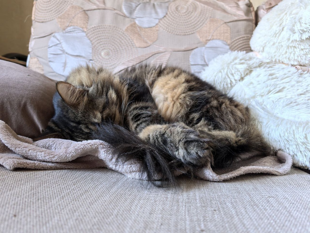 Всем привет! С вами Кузя Кусалочкин и, как вы уже поняли по названию, сегодня буду жаловаться, расскажу о неподобающем отношении. Утром получил паштетик, а потом захотел ещё и сливочек. После завтрака пошёл немного отдохнул. Понял, что не наелся и пришёл выпрашивать у хозяйки еду. Мне дали четвертинку паштета. Немного поактивничал, побегал с бумажечками и лёг спать: Опять Ж притулил к мишке: Хозяйка никак не может постирать этот плед и даже поправить. Т.к. вечером тут сидит хозяин, а днем сплю я, ну а в другое время она просто забывает и так каждый день. А теперь пришло время рассказать на что же я жалуюсь. У меня закончился наполнитель. Точнее, его запасы. А в лотке его уровень тоже стремительно падает. Обещали купить, возможно, даже сама хозяйка притащит этот мешок. А вот вторая проблема посерьёзнее. В обед я проснулся и пришёл выпрашивать вкусности. Хозяйка пожалела меня и дала оставшуюся четверть паштета. Я насытился, но всего лишь на время. А потом опять пришёл к хозяйке, п