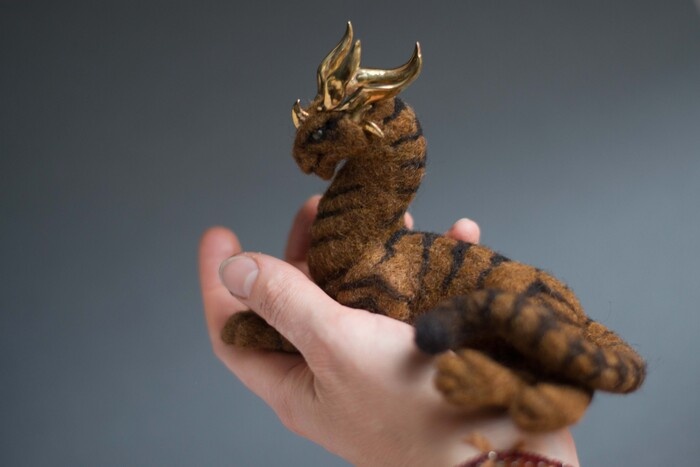 Давно хотела совместить два своих любимых дела - валяние и работу с латунью. У меня были готовы рога (лепила модель из пластичного воска, относила к ювелиру в литьё и потом обрабатывала), к ним решила свалять зверя. Делала его по частям в прямых эфирах, без подробного эскиза, примерно держа в голове образ, на который ориентируюсь. Хотелось чего-то среднего между тигром и драконом. Рисунок окраса сложился стихийно - тигриные полоски трансформировались в фантазийные, голова тоже была полной импровизацией. Было очень интересно, как работа, которую я сама же и делаю, получается спонтанной и меня удивляет. Вот такой тигродракон получился. Рога и шипы из ювелирной латуни, глаза - натуральный камень соколиный глаз. Каркас только в шее и в хвосте, остальное - овечья шерсть. Длина - 15 см, высота - 11 см Вот думаю, надо ли ему делать подушечки лап и нужно ли повесить латунную цепь на шею, для пущей царственности? Пост автора sinitca.felt. Читать комментарии на Пикабу.