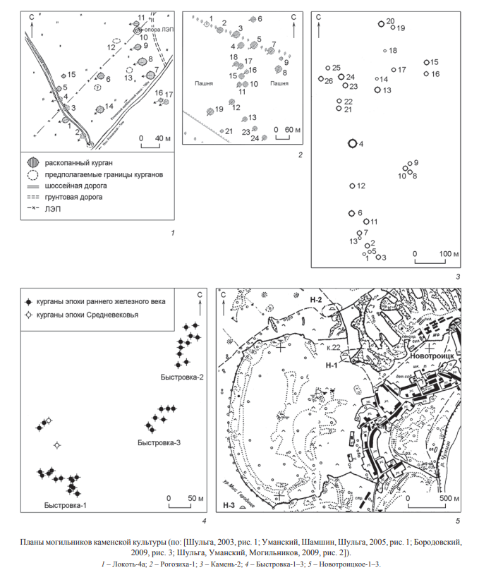 К настоящему времени на территории Алтайского края и Новосибирской обл. захоронения каменской культуры выявлены на более чем 60 памятниках (см.: [Троицкая, Бородовский, 1994; Могильников, 1997; Фролов, 2008, с. 33–36]). Среди них можно выделить группу наиболее крупных исследованных курганных могильников, материалы которых были полностью или по большей части опубликованы: Быстровский некрополь (Быстровка-1–3) [Троицкая, Бородовский, 1994; Дураков, Мжельская, 1995; Бородовский, 2002, с. 51–52], Новотроицкий некрополь (Новотроицкое-1–3) [Шульга, Уманский, Могильников, 2009], могильники Рогозиха-1 [Уманский, Шамшин, Шульга, 2005] и Локоть-4а [Шульга, 2003]. В ходе анализа планиграфии указанных могильников было обращено внимание на их трехчастное устройство. По три группы курганов зафиксировано на могильниках Рогозиха-1 и Локоть-4а (Три «неправильные цепочки» отмечались и на могильнике Леонтьевка, хотя по опубликованному плану это не столь очевидно [Арсланова, 1962, с. 77, табл. I].). Формально эта особенность сопоставима с Быстровским и Новотроицким некрополями, включавшими по три могильника. Однако последние относятся к образованиям иного порядка. В Рогозихе-1 и Локте-4а речь идет о сравнительно небольших группах (цепочках) курганов, отстоящих друг от друга на 60–80 м (см. рисунок, 1, 2), тогда как в Быстровском и Новотроицком некрополях количество курганов в компактных группах значительно больше, и они отстоят друг от друга на расстояние 200–400 м (см. рисунок, 5) (Могильник Новотроицкое-3 находится на более значительном удалении, примерно в 2,5 км к ЮЮЗ от Новотроицкого-1. Тем не менее наличие хронологически близкого, столь же крупного (в 1956 г. там было зафиксировано 28 курганных насыпей) могильника на одном «пятачке» [Шульга, Уманский, Могильников, 2009, с. 132–133] позволяет предполагать взаимосвязь всех трех могильников, расположенных у с. Новотроицкое.).