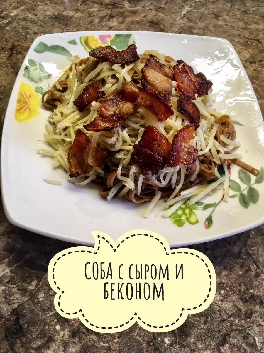 🧏🏻♀️ Вариант необычной, но вкусной собы. 👩🏻🍳Приготовление: 1. Режем не сильно мелко бекон. Обжариваем его до румяности с двух сторон. 2. Собу отвариваем по инструкции. Варится она быстро-буквально несколько минут. 3. Горячую отваренную собу посыпаем натертым сыром и сверху выкладываем обжаренный бекон. Очень сытное и быстрое блюдо. Приятного всем!!