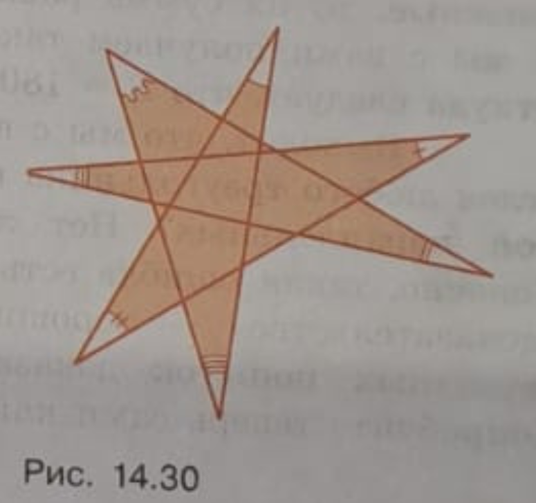 Найдите сумму углов при вершинах семизвенной замкнутой ломаной, показанной на рисунке 14.30 Введем обозначения Найти: a+в+x+y+z+n+m Найдем внешние углы треугольников, выделенных на рисунке: Рассмотрим получившийся треугольник: т.к. сумма углов в треугольнике 180 градусов, значит и в+z+m+x+n+a+y=180 градусов. Ответ: в+z+m+x+n+a+y=180 градусов