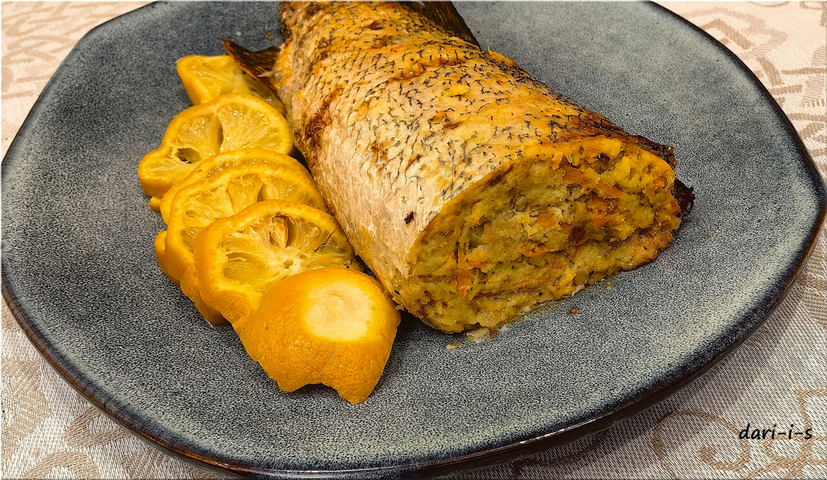Предлагаю Вам классику отечественной кулинарии - фаршированную щуку. Этому рецепту меня научила мама. Блюдо совершенно не сложное. Немного времени на разделку рыбы и Вы получите замечательно вкусное и нарядное блюдо. Нам потребуются: Щуку моем, чистим от чешуи, снова моем. Отрезаем голову (некоторые оставляют кусочек кожи, соединяющий голову со шкурой, но я не вижу в этом особого смысла), вынимаем жабры, моем. Аккуратно подцепляем ножом кожу по бокам и, засовывая внутрь пальцы, отделяем кожу чулком от тушки рыбы. Это не сложно, но надо быть аккуратными в районах плавников. На шкуре останутся кусочки мякоти, их легко соскрести ножом для масла. Филе рыбы снимаем с костей и складываем отдельно. Одну луковицу мелко режем, морковь натираем на крупной тёрке, чеснок мелко рубим. Пассеруем овощи до полной готовности на сливочном масле. Хлеб заливаем сливками. Готовим фарш. Филе щуки, оставшуюся луковицу и слегка отжатый хлеб пропускаем через мясорубку. Солим, перчим. Добавляем пассерованные о