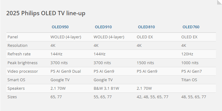 Philips представила свою новую линейку OLED-телевизоров, анонсированную на 2025 год. Модели OLED950 и OLED910 оснащены инновационной 4-слойной панелью и 4-сторонней подсветкой Ambilight. В то же время более доступные телевизоры OLED810 и OLED760 предлагают все необходимые функции по более привлекательной цене. Как и LG и Panasonic, Philips переходит на последнее поколение WOLED и отказывается от микролинз (MLA). Телевизоры будут доступны в размерах от 55 до 77 дюймов, охватывая весь спектр моделей 9-й серии. Новая OLED-панель предлагает значительное улучшение благодаря своей 4-слойной структуре с источниками красного, зеленого и синего света. Известная как Primary RGB Tandem или Meta 3.0, эта панель, по словам Philips, обеспечивает пиковую яркость до 3700 нит и полноэкранную яркость в 350 нит, а также охватывает 83% цветового пространства Rec.2020. Фильтр ультранизкого отражения блокирует 99% отражений на экране, что делает изображение более четким и реалистичным. Кроме того, эта пане