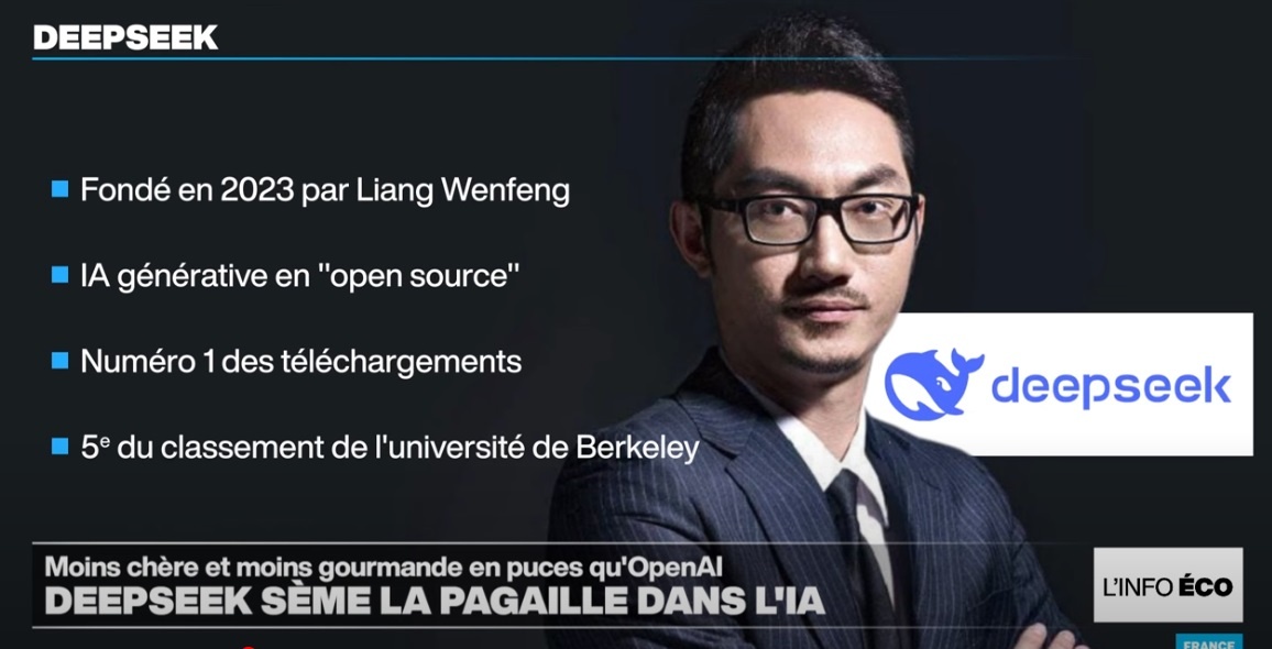 По следам дискуссии на французском телеканале France 24. Мы обратимся к этому черному дню для американских технологий. NASDAQ, индекс технологий, упал на чуть более чем 3%, а некоторые фирмы упали до 30%. Но символ этого дня – акции Nvidia производителя чипов, который был до вчерашнего дня самой дорогой фирмой на мировой бирже. Его акции упали на 17% на момент закрытия, но в особенно - ценность предприятия. Она упала на 589 миллионов долларов за один день. Никогда еще ни одна компания не теряла такие деньги за один день. Это в два раза превышает предыдущий рекорд, который тоже принадлежит Nvidia. И почему же такое падение? Для объяснения – одно только слово. И это слово DeepSeek. Что этотакое? DeepSeek - это робот общения, конкурент ChatGPT и Claude, которыми вы, возможно, пользуетесь. DeepSeek был создан этим человеком. Лян Веньфэн в 2023 – китайским предпринимателем, которому в этом году исполнится 40 лет. Его чат доступен уже несколько месяцев. Но на прошлой неделе вышла новая верси