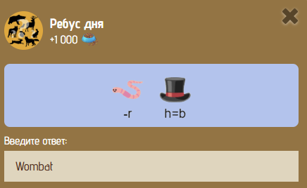 Сегодня 29 января снова вышел новый ребус в игре зоо в телеграм. Ответ на ребус дня сегодня 29.01 — Wombat Наш Telegram - https://t.me/mir_tapalok В нашем Telegram публикую помимо ответов на загадки и ребусы игры Zoo, расписание с появлением коробок с кормом на 29 января