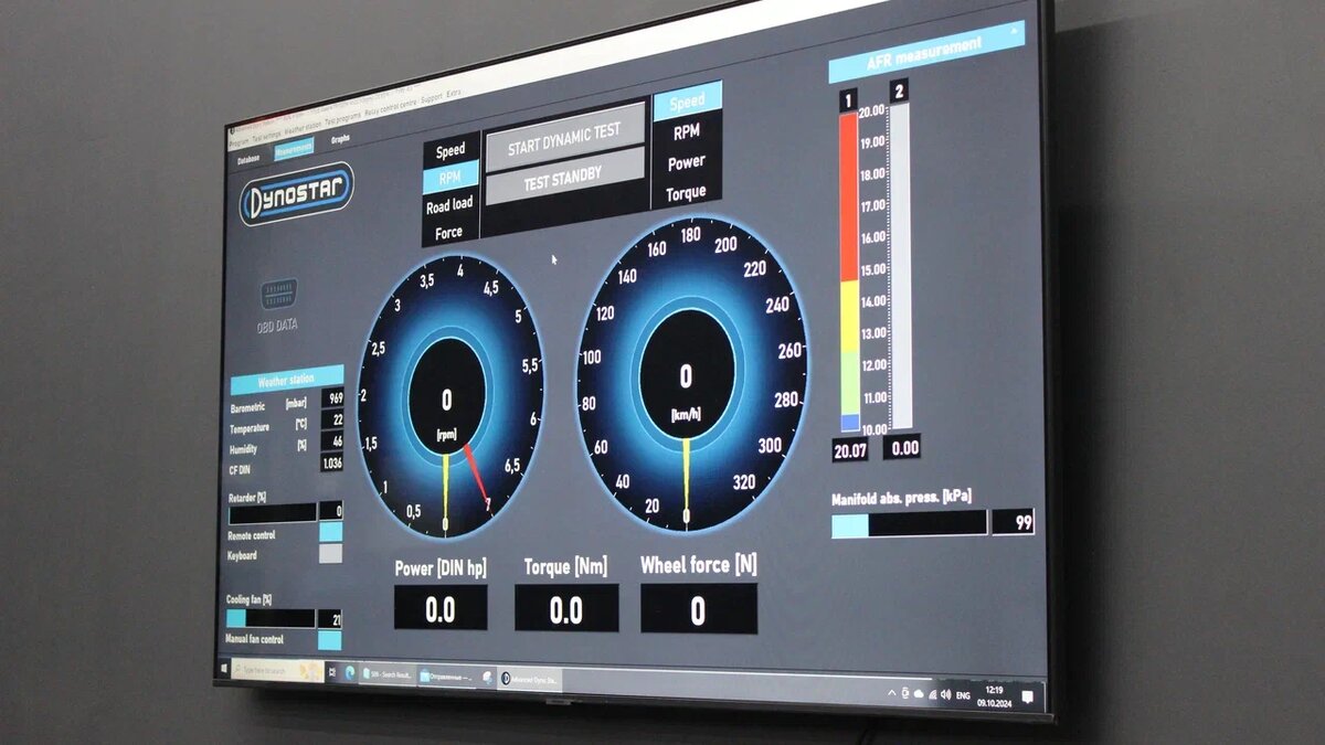 Чтобы создать условия, похожие на настоящую дорогу, мы использовали передний вентилятор Dynostar cooling fan C604. Он продувает машину холодным воздухом, как будто вы едете на улице. Также у нас был шланг для отвода выхлопных газов и модуль AFR-лямбда BOSH, который помогает определить, как правильно смешиваются воздух и топливо во время сгорания.