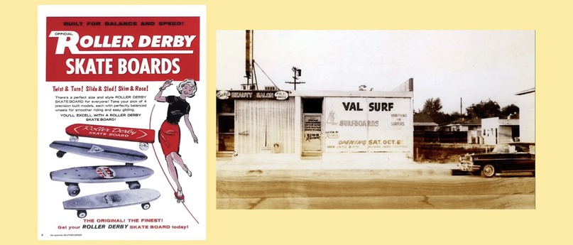 И несколько лет спустя, Барри Джейкобс основал компанию Roller Derby. Сейчас мы возвращаемся в 60—е, скейтборды были просто игрушкой и их использовали на детских площадках. Но позже это стало модным увлечением. И в 1962 году Val Surf стал первым магазином для серфинга где продавались скейтборды.