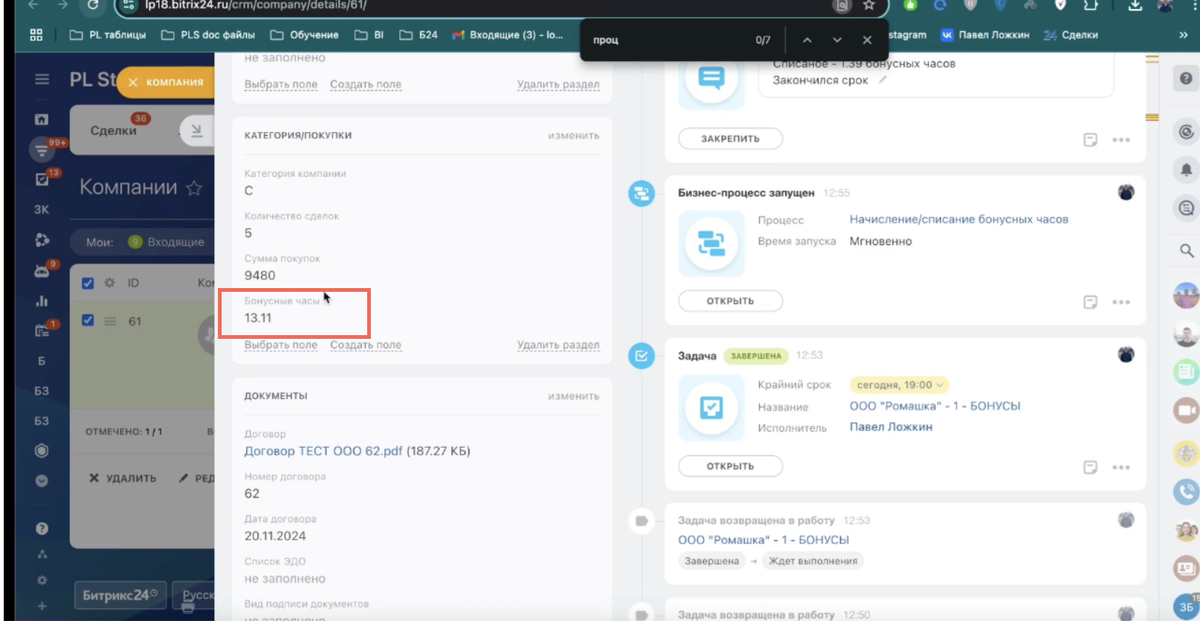 Сегодня расскажем о бизнес-процессе списания бонусных часов для клиентов. Итак, у нашей компании есть бонусные часы (или баллы, в зависимости от вашего бизнеса). К примеру, у одной из компаний 13 часов. Что делаем дальше? Ставим задачу, привязываем к группе "отработка часов" и конкретной компании, а также можно прикрепить сделку или смарт-процесс. Запускаем таймер и фиксируем, сколько времени мы потратили. Например, 1 час 10 минут. Когда задача закрыта, запускается бизнес-процесс через приложение «Запуск БП». Этот процесс выглядит следующим образом: Вычисляем количество использованных часов и запускаем процесс списания. Мы также отображаем уведомление о списании часов. Например, у компании ID 61 изначально было 13,11 часов, а после списания остается 1,93 часа. Если вам нужен подобный процесс, не стесняйтесь обратиться к нам! Контакты указаны в описании профиля. Мы поможем вам настроить его. Также напоминаем! У нас есть бонусные часы за покупку или продление лицензии через нашу компанию