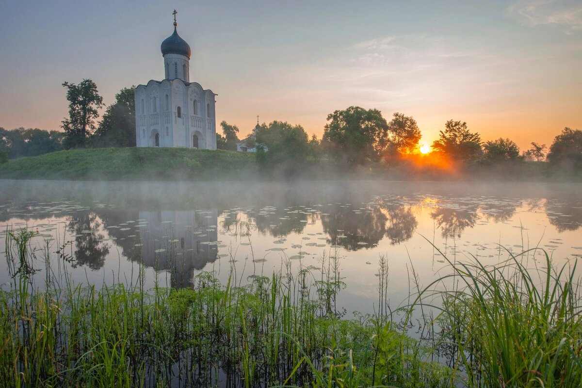 Храм покрова на Нерли и Боголюбовский монастырь. Утренний туман получается поймать далеко не всегда. Но если повезет, то симпатичные кадры можно сделать и через час после рассвета. На этой съемке до рассвета туманило прилично, но с восходом солнца туман почти мгновенно испарился. Я рассчитывал сделать более атмосферные кадры и в большем количестве. Но показываю, что есть. Какой из этих кадр выбираете: Солнечный, туманный, оригинальный или перспективу?
