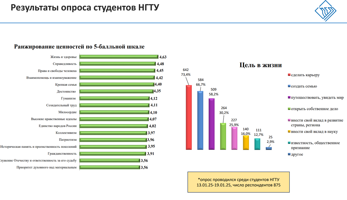 Что движет современным студентом? Какие ценности определяют его выбор? Что мотивирует его к развитию? Эти вопросы стали отправной точкой масштабного исследования, проведенного в Нижегородском государственном техническом университете им Р.Е.Алексеева в январе 2025 года. Опрос 875 студентов не просто предоставил статистические данные – он открыл нам глубокое понимание мировоззрения нового поколения, разрушив многие устоявшиеся стереотипы о современной молодежи. Результаты исследования опровергли распространенное мнение о меркантильности современных студентов. По пятибалльной шкале наивысшие оценки получили фундаментальные гуманистические ценности: жизнь и здоровье (4,63 балла), справедливость (4,48) и права человека (4,45). За ними следуют взаимопомощь и взаимоуважение (4,42) и крепкая семья (4,40). Примечательно, что традиционные общественные ценности, такие как достоинство (4,35) и гуманизм (4,12), оцениваются современными студентами выше, чем коллективизм (3,97) и патриотизм (3,96).