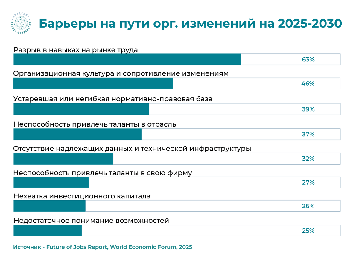 Современный бизнес-ландшафт постоянно трансформируется, требуя от организаций гибкости и адаптивности. Однако внедрение изменений — процесс, сопряженный с множеством препятствий. Исследование 2025 года Всемирного экономического форума, охватившее более 1000 ведущих работодателей из 55 экономик, выявило ключевые барьеры на пути организационных преобразований. 🚩Наиболее острой проблемой оказался разрыв в навыках на рынке труда — нехватка квалифицированных кадров (63% респондентов). Этот фактор лидирует в 52 из 55 исследованных экономик и 19 из 22 секторов. Метафорически, этот разрыв можно сравнить с пропастью между текущими компетенциями сотрудников и требованиями стремительно меняющегося рынка. 🚩Второе место занимает организационная культура и сопротивление изменениям (46%). Эта проблема подобна якорю, удерживающему компанию на месте, когда необходимо двигаться вперед. Она подчеркивает ожидаемую проблему согласования внутренних процессов, организационных структур, иерархий и мышления