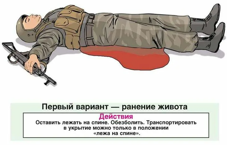 Травмы живота могут быть закрытыми (без ранения брюшной стенки) и открытыми (при наличии раны на животе): Повязка начинается с наложения циркулярных туров на животе. Следующие туры поднимаются вверх, закрывая нижележащие на две трети. После наложения повязки конец бинта следует зафиксировать доступными способами. Основной задачей первой помощи при травмах живота является остановка кровотечения при открытой травме (прямым давлением на рану, наложением давящей повязки). Выпавшие внутренние органы необходимо закрыть стерильными салфетками (желательно, смоченными водой) или чистой тканью. При закрытых травмах живота повреждения его передней стенки могут быть малозаметными. При этом пострадавшие могут жаловаться на постоянную острую боль по всему животу, сухость во рту, тошноту и рвоту. При повреждении внутренних органов пострадавший нуждается в скорейшей хирургической помощи, поэтому необходимо положить холод на живот, пострадавшему придать положение на спине с валиком под полусогнутым