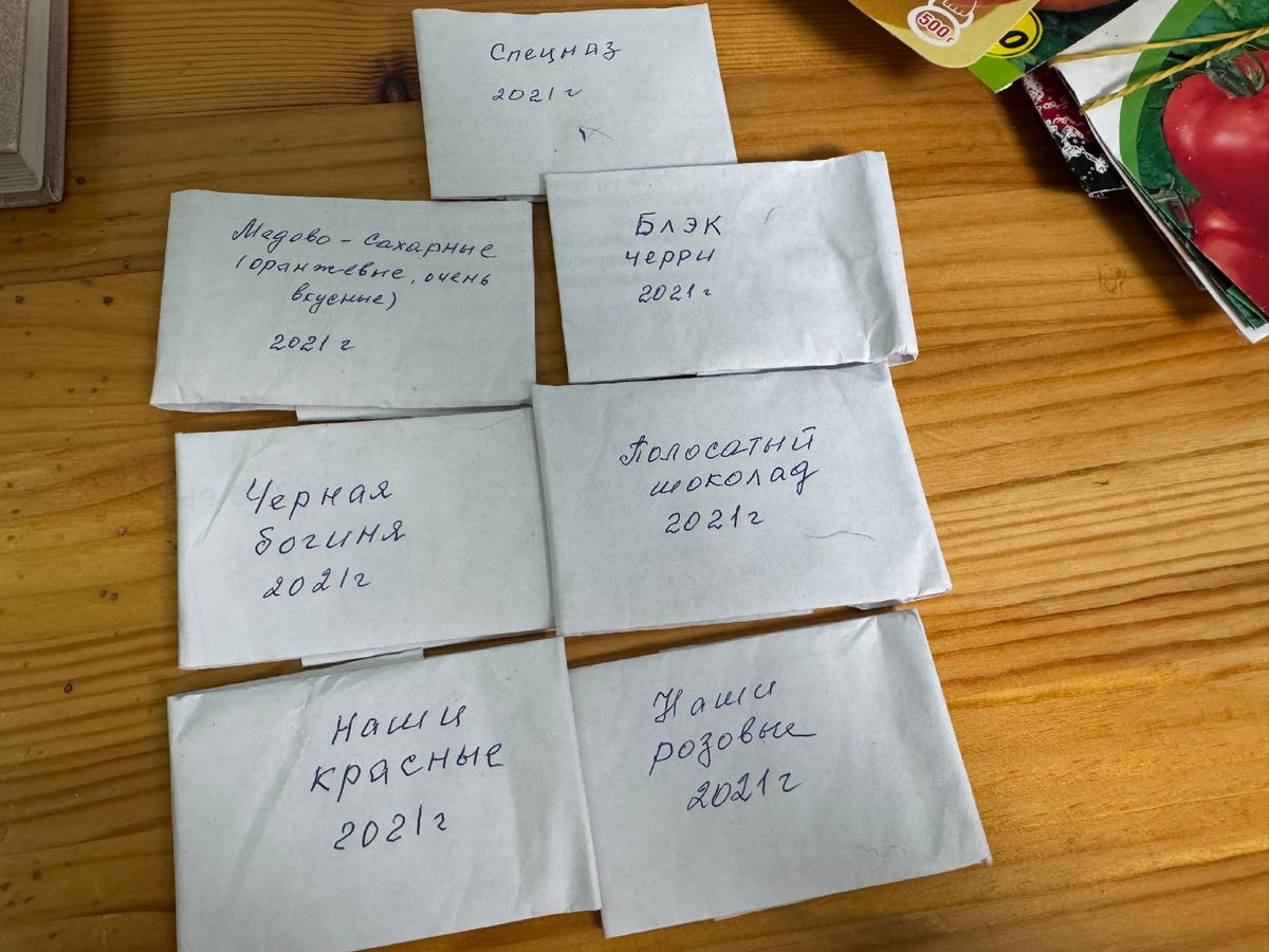 Добралась я вчера то семян томатов. Хоть посмотреть, осталось ли что-то с прошлого года. По ощущениям казалось, что не осталось ничего🤷♀️ И они оказались очень близкими к реальности 😂 Остались семена, которые мы самостоятельно с мамой выпускали. Наши красные и розовые, Полосатый шоколад, Черная богиня, Спецназ, Блэк черри и Медово-сахарные. Их сею каждый год последние лет 5, а может и больше😂 В этом году буду самостоятельно пробовать выпускать семена, без маминого участия. Посмотрим, что получится… А то эти семена еще 21 года. Остались семена Дикая Роза - крупный очень вкусный томат, тоже часто его сажаю. И Бычье сердце оранжевое. Кто читает мои публикации про огород, уже в курсе, что этот сорт я прикупила еще, не зная, что он у меня есть. Точнее не помня об этом😂 В очередной раз обещаю себе, что сначала буду проверять, что есть, а чего нет. Ладно, что продублировала только один пакетик одного сорта. Дальше мои низкорослые любимчики. Медвежья кровь вкусный мясистый томат. Очень