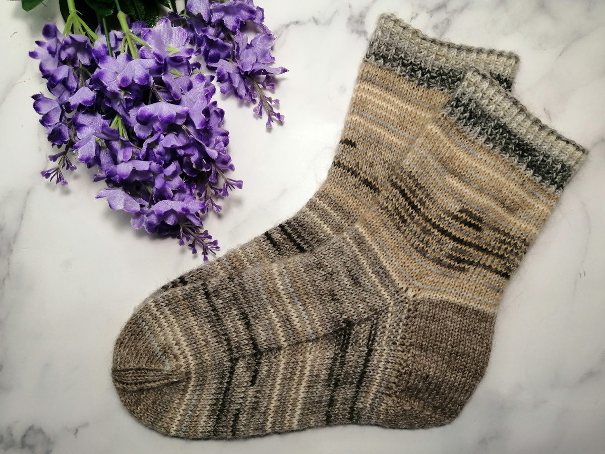 Добрый день, друзья! Продолжаю пополнять носочную коробочку и пристраивать остатки пряжи. Сегодня поделюсь идеей сочетания 3 пряж, одна из которых совсем не носочная. Получились симпатичные носочки. Назвала их "Три пряжи", так как связаны они действительно из 3 видов пряжи, сочетающихся по цвету. Две пряжи от Ализе: пестрая Artisan (цвет 9005), бежевый меланж - Superwash (цвет 207), пушистая ангора от YarnArt (цвет 511). Набрала пестрой пряжей 64 петли усиленным эластичным набором на спицы 2,5 и связала резинку 1х1 со скрещенной лицевой петлей. Далее перешла на паголенок. Вязала его на нужную высоту методом Хеликс, чередуя пеструю нить и ангорскую. Паголенок получился слегка пушистый. Далее вязала пяточку-подкову из бежевой нити. Как я ее вяжу можно посмотреть в любой моей публикации. После того, как по стенкам пятки добрала по 16 петель с каждой стороны, вяжу вкруговую, чередуя бежевую нить и пеструю. Клин подъема вяжу платочной вязкой на 8 петлях, убавления делаю в каждом 6 ря