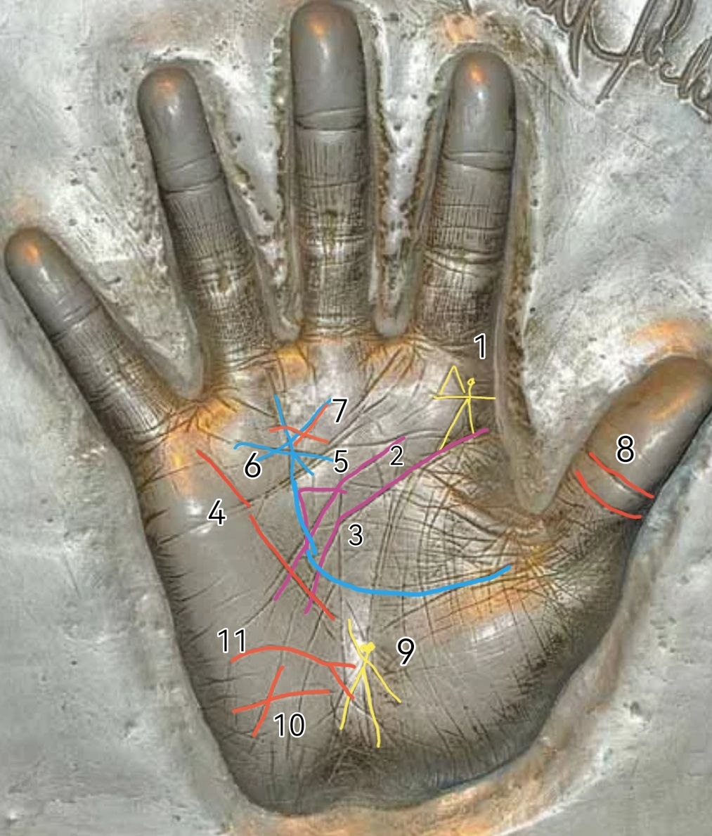 Разбор руки Майкла Джексона🕺 1. Звезда на Холме Юпитера. Да ещё и в виде человека. Знак "говорящий" о реализации способностей человека. Высшие карьерные достижения. Одна из рук словно держит микрофон, котрый обозначен в виде треугольника. А треугольник на Юпитере - знак большой славы и всемирного признания и авторитета в профессиональной деятельности. 2. Две линии Ума. Этот редкий знак даёт ряд способностей: - сила мысли. Умение воплощать задуманное в реальной жизни. - магические и гипнотические способности. Умение влиять на подсознание окружающих. 3. Необычайная одаренность человека, его разносторонние таланты. 3. Линия Ума имеет резкий загиб вниз. Это давало депрессии, зависимые состояния, периоды неуверенности и сомнений. 4. Отличная линия Меркурия, которая наделяла финансовой удачей, предприимчивостью и голосовыми данными. Линия пропадает временно в районе 50 лет. 5. Треугольник на линии Ума, котрый смотрит в сторону Меркурия и Аполлона. Это - умственные способности, направл