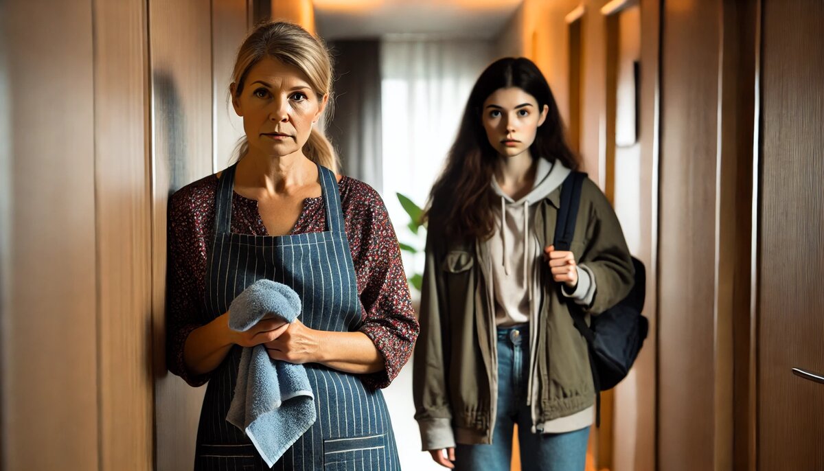 Несколько минут ушло на то, чтобы упаковать документы и пару предметов из комнаты — ноутбук, тетради, пару любимых книг. Лариса стояла, прижав к груди влажную тряпку для уборки, будто без неё не знала, куда деть руки. Когда Марина уже надела куртку, и Костя взял сумки, дочь всё-таки обернулась: