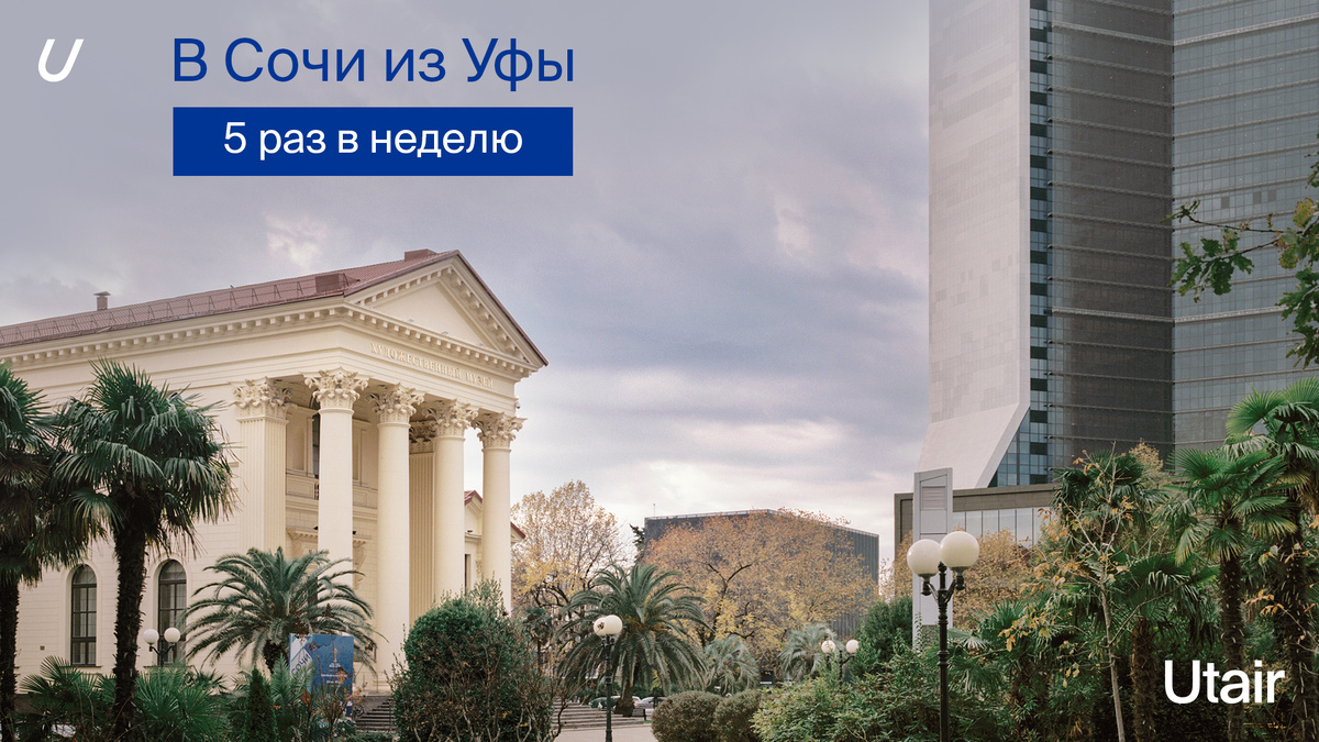 Со 2 июня начинаем выполнять рейсы в курортную столицу России — Сочи — из Уфы! Полеты запланированы 5 раз в неделю — по понедельникам, вторникам, пятницам, субботам и воскресеньям. ✈ Время в пути — 3 часа 30 минут. Также Utair будет выполнять полеты летом в Сочи из Москвы, Нижневартовска, Сургута, Тюмени и Ханты-Мансийска. ➡ Посмотреть расписание, а также приобрести билеты по выгодным ценам можно уже сейчас — на сайте utair.ru и в мобильном приложении «Уютное небо».