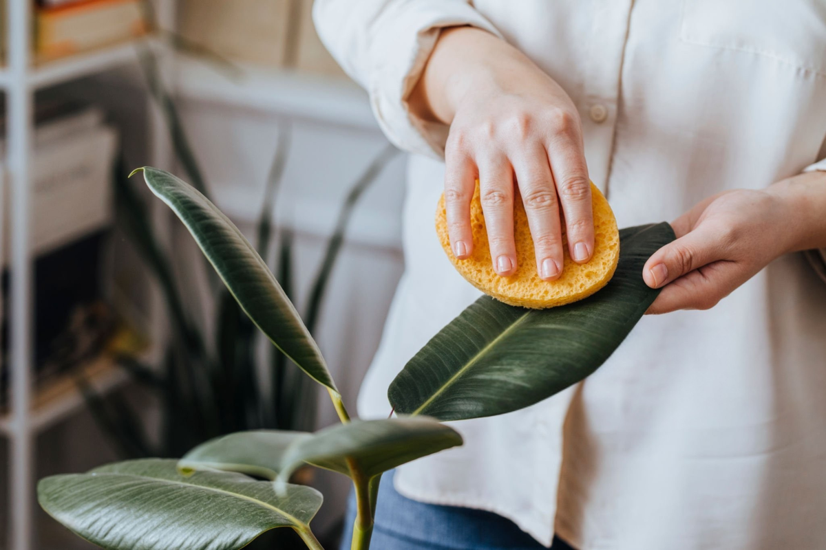 - Окуните губку, слегка отожмите и аккуратно протрите листья, поддерживая их другой рукой, чтобы не сломать.