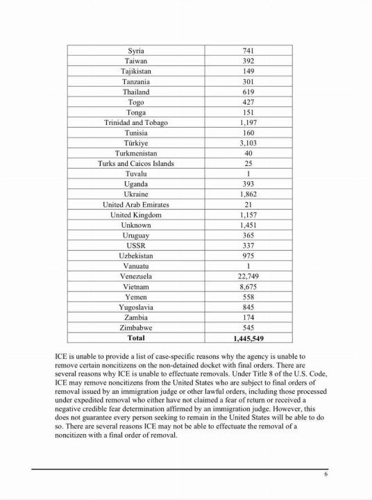 В общей сложности, согласно отчету ведомства, депортации подлежат почти полтора миллиона мигрантов из разных стран мира. Интересным фактом является присутствие в списке таких несуществующих государств, как СССР и Югославия. Пока неясно, каким образом власти США планируют решать вопрос с депортацией лиц, имеющих паспорта этих расформированных стран.