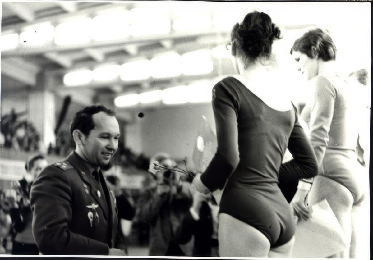 Седьмой выпуск ладных красавиц-спортсменок из СССР открывает снимок 1974 года, сделанный в городе Тольятти. На нем летчик-космонавт Г. Сарафанов вручает призы победителям среди женщин по спортивной акробатике.