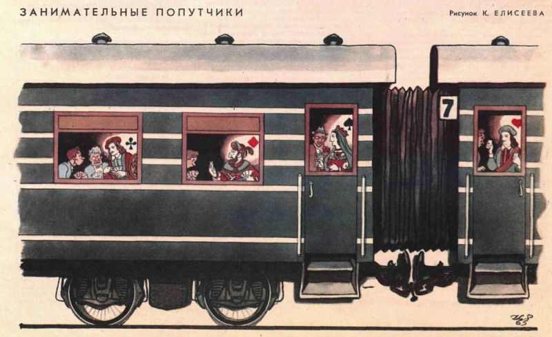 60 лет назад, в январе 1965 года, смеялись над разными темами. Например, над таким, как считалось, пережитком прошлого, как карточная игра. Здесь художник язвит над обычаем коротать время за картами во время поездок по железной дороге: