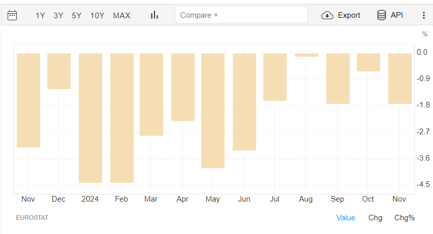 С приходом Трампа необходимо пересмотреть в целом на то, что происходи и может происходить в дальнейшем. Однако на данный момент данных для анализа который позволит собрать картину мира в целом недостаточно. Много слов мало реальных дел и чисел. Давайте, посмотри общую динамику и попробуем очистить реальный мир от словесных интервенций. Итак. Евросоюз - Промышленное производство. 12 месяцев. Три года. Падение промышленного производства с апреля 2023 года. Двадцать один месяц подряд. Последних данных нет, вряд ли есть реальные положительные изменения. Будем реалистами промышленное производство это то, что можно пощупать. числа ВВП также как и много другое можно накачать дутыми числами. Евросоюз - Использование произв. мощностей. Три года. Беспрерывное падение в течении трех лет, без всяких намеков на изменение динамики. Евросоюз - Обрабатывающая пром. 12 месяцев. Три года. Беспрерывное падение с июля 2023 года. Шестнадцать месяцев подряд. Евросоюз - Производство стали. Беспрерывно