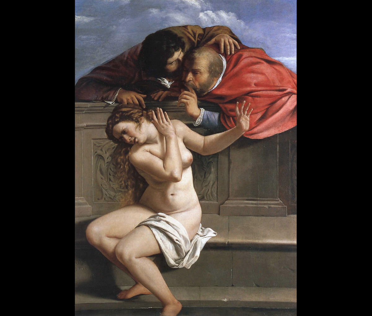 История Сусанны повествует о прекрасной замужней женщине, которую увидели и возжелали двое старейшин. Как-то она решила искупаться в своем саду. Отослав слуг за маслами, красавица начала готовится к процедуре. Увидев что слуг нет, старейшины приблизились к ней и начали требовать сексуальных услуг, угрожая заявить, что видели её с молодым любовником, если она им откажет. Сусанна отвергла их, и они, верные своему обещанию, лжесвидетельствовали против неё. Будущий пророк Даниил допросил старейшин по отдельности, и когда детали их рассказов не совпали, понял, что они лгали, и приговорил их к смерти. А Сусанна, отказавшаяся подчиниться требованиям старейшин, стала примером добродетели и супружеской верности. Рассматриваемая картина «Сусанна и старцы» Артемизии Джентилески (1593-1653) раскрывает художницу, как тонко чувствующую нюансы повествования. В то время как история Сусанны чаще всего представлялась в виде горизонтальной композиции, версия Артемизии выстроена вертикально, что позв